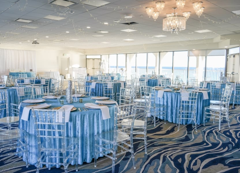 Old Florida meets new in the sixth floor ballrooms of our beach house. With floor-to-ceiling windows offering sweeping ocean views, and an airy balcony, this ballroom puts your events a cut above the rest.